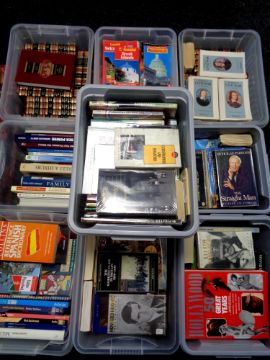 A pallet containing nine plastic lidded storage crates containing books, various