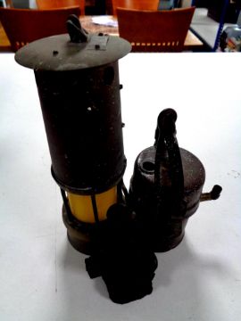 Two vintage 20th century miner's lamps together with a coal miner's figure