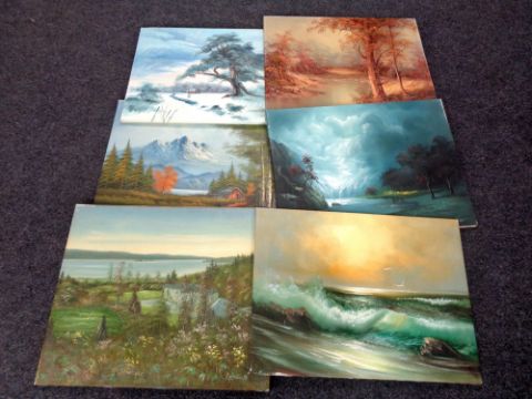 Six unframed oil on canvas to include woodland scenes, seascapes, landscapes