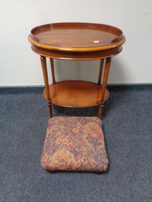An oval yew wood two tier occasional table together with a tapestry upholstered foot stool on bun feet