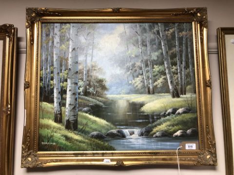 A 20th century oil on canvas : A gentle stream with birch trees, signed Rayalfonse