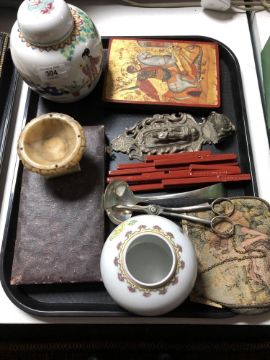 A tray containing two Chinese porcelain ginger jars, religious icon, sealing wax, small alabaster urn, cutlery etc
