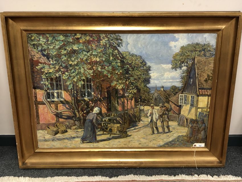 Continental School : Figures on a cobbled street, oil on canvas, 104 cm x 70 cm