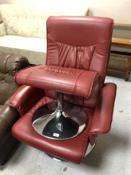 A red leather upholstered swivel chair on chrome base with matching footstool