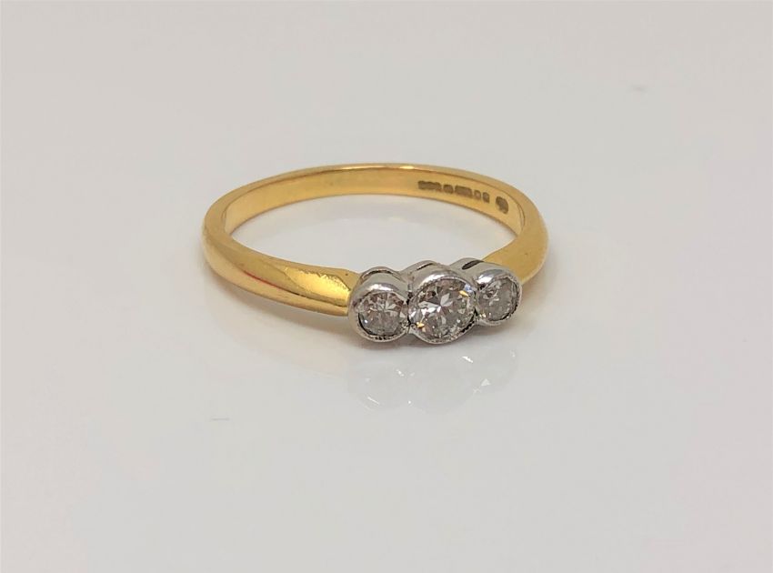 An 18ct gold three stone diamond ring, stated total diamond weight .43 carat, size Q