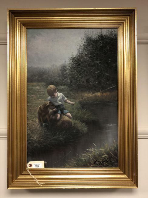 Continental School : A boy and a dog fishing by a stream, oil on canvas, 58 cm x 38 cm