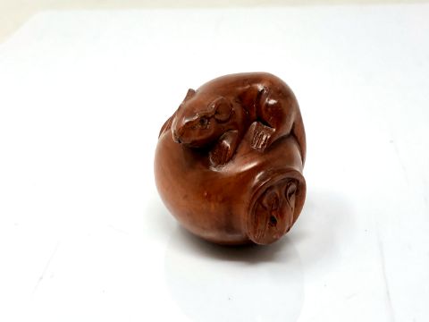 A carved Chinese hardwood netsuke - Rat climbing on a pot