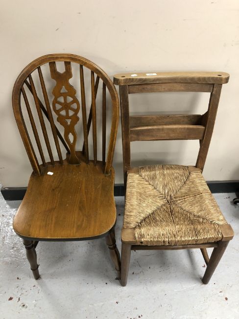 A beech church chair with rattan seat together with further wheel backed chair