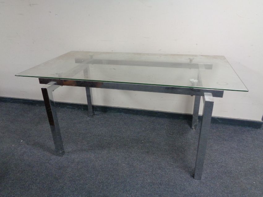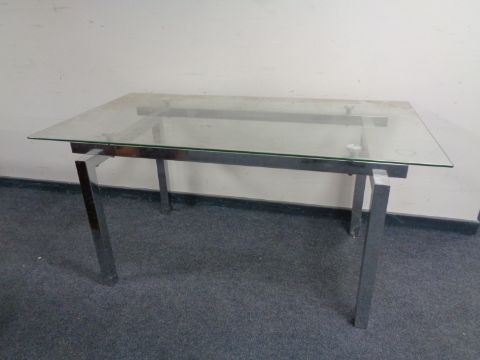 A contemporary chrome dining table with glass top