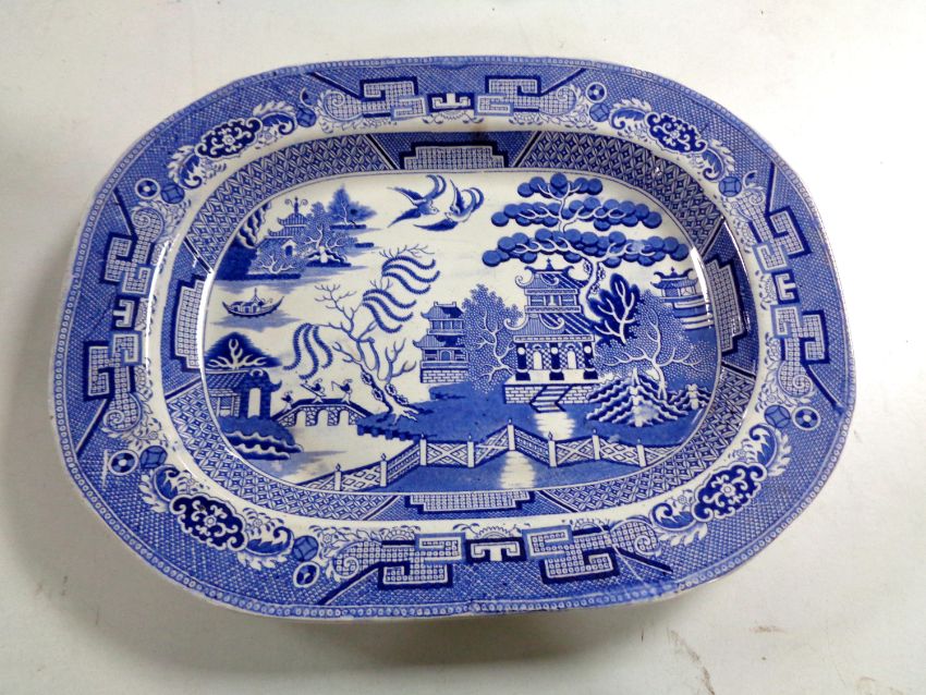 An early 19th century blue and white willow pattern meat plate by Hulme and Booth