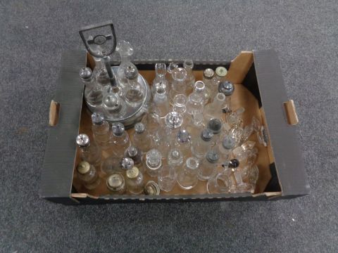 A box of glass sifters, plated cruet set, glass decanter stoppers etc