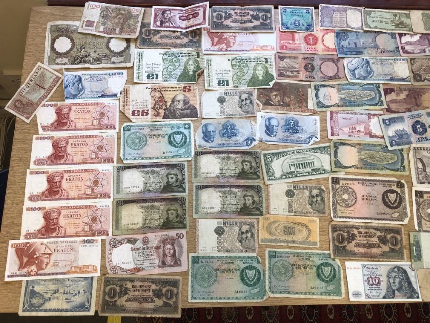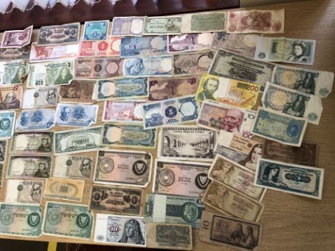 A box of assorted decimal and pre-decimal English coins, commemorative crowns etc, together with a large quantity of world bank notes including Spain, Portugal, Greece, United Arab Emirates, Japan etc