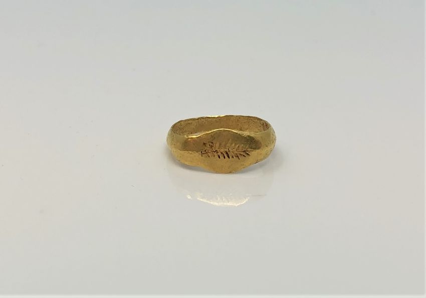 A Roman gold child's ring CONDITION REPORT: The ring weighs approximately 1g, it is a little misshaped, approximately 12.67mm across at the widest point. The crown is lightly marked with chevron decoration otherwise it is entirely plain and not marked.