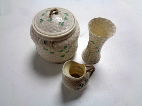 Three pieces of Belleek cloverleaf patterned china to include lidded biscuit barrel, milk jug and vase