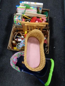 Two boxes containing a quantity of children's puzzles, toys, dolls, Russian doll, together with a child's pram and Moses basket