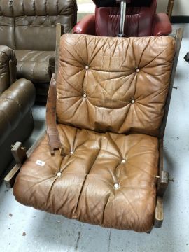 A twentieth century continental beech framed chair with tan leather upholstered cushion (Af)