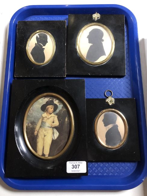 Three early 19th century silhouette portraits together with an antiquarian print of a boy