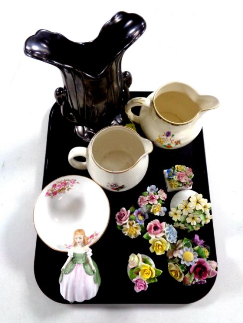 A tray containing china flower posies, Beswick silvered Art Nouveau vase numbered 1185, Beswick and Myott jugs etc
