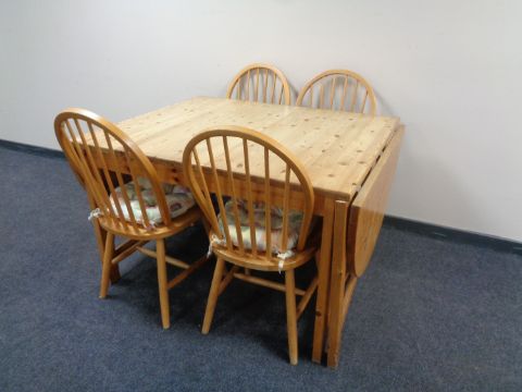 A pine drop leaf extending dining table and four spindle backed chairs