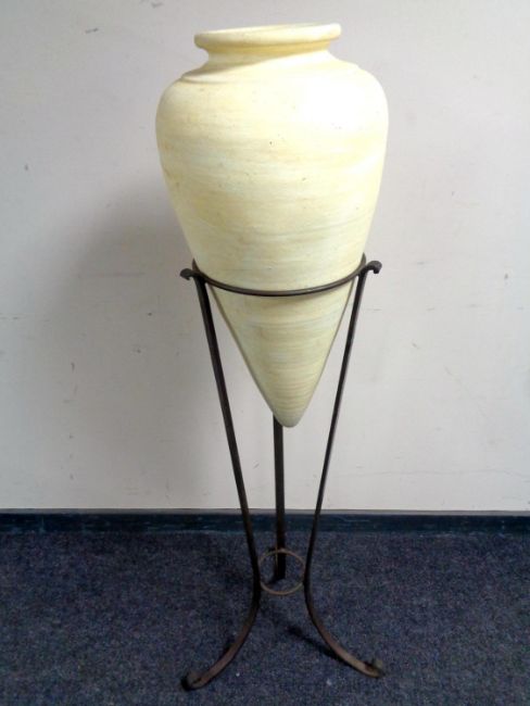 A contemporary conical form pottery vase on metal stand