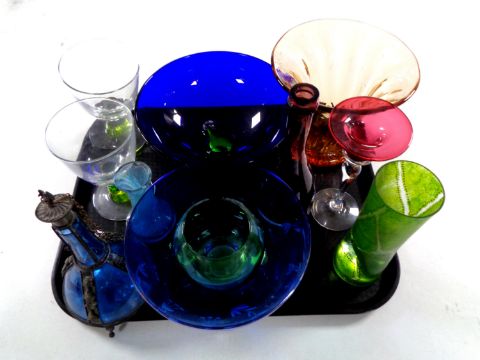A tray containing a quantity of 20th century coloured glassware including bowls, decanter with stopper, wine glasses etc
