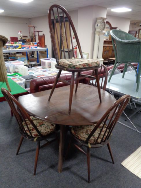 An Ercol stained elm drop leaf dining table and a set of four high back spindle dining chairs