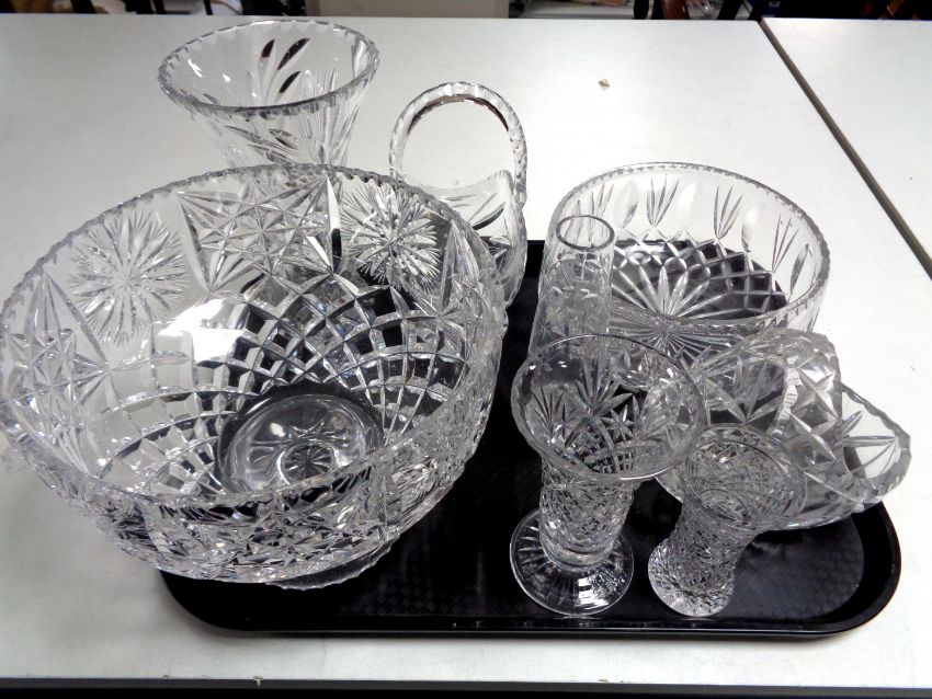 A tray of cut glass and lead crystal to include fruit bowls, baskets, vases