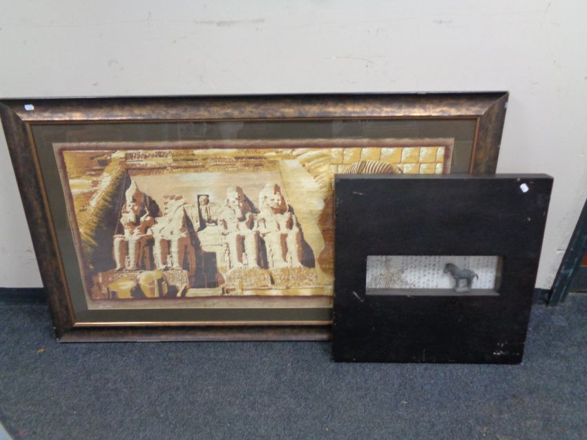 A large framed Egyptian painting on papyrus together with a Chinese Tang horse in display frame