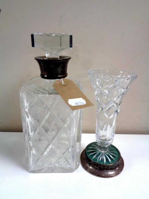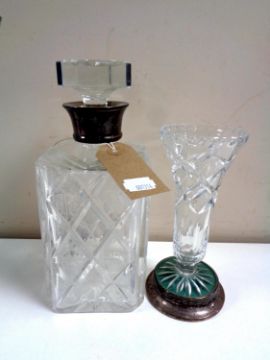 A cut glass whisky decanter with silver collar together with a further cut glass vase on silver base