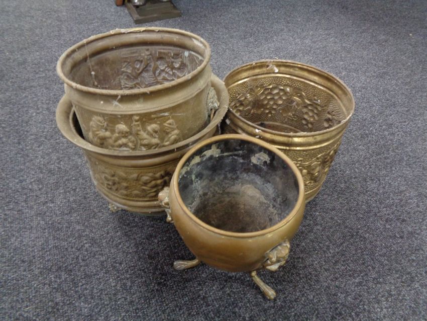 Three embossed brass planters together with a further brass planter on raised feet