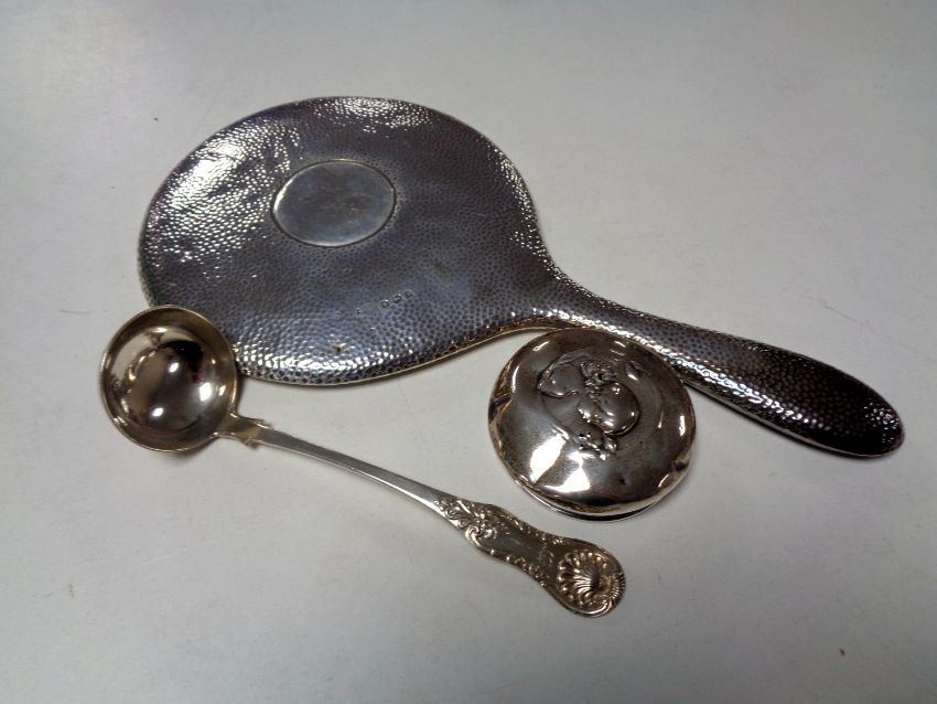 A silver spoon, Gilmour & Watson, Glasgow 1945, together with a Birmingham silver hand mirror and an embossed jar lid