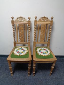 A pair of 20th century carved oak barley twist hall chairs with tapestry seats