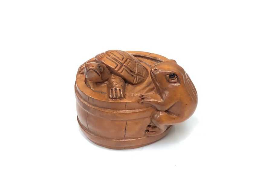 A carved Chinese hardwood netsuke - Turtle and frog in barrel