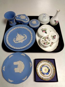 A tray of cabinet china including boxed Royal Worcester Millennium dish, six pieces of Jasper ware, five pieces of Wedgwood Hathaway rose together with Limoges lidded pot