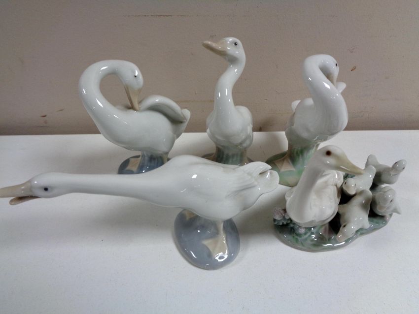 A Lladro figure group of a geese with goslings together with four further Lladro figures of geese. (5)