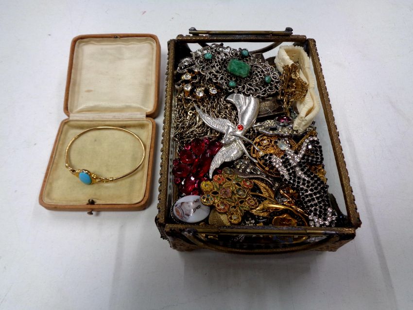 A jewellery casket containing assorted costume jewellery to include enamel brooch, Art Deco brooch, gilt bracelet etc