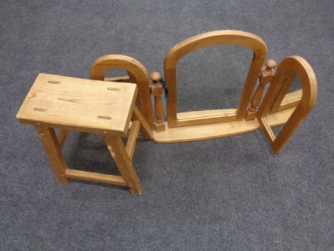 A rustic pine stool together with a pine triple dressing table mirror
