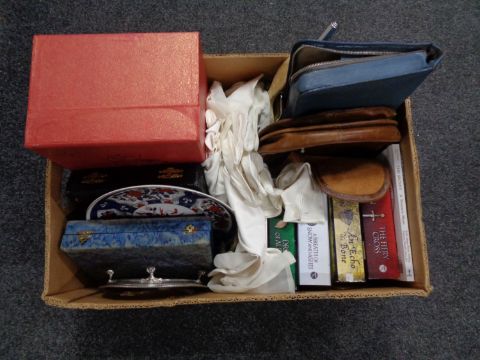 A box of miscellany to include oriental plate and ornament, cased cutlery, travel set, books, gloves etc