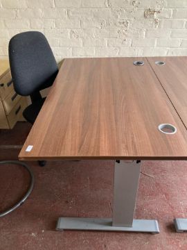 A Dark oak effect desk, width 140 cm, together with a black swivel chair. (2)