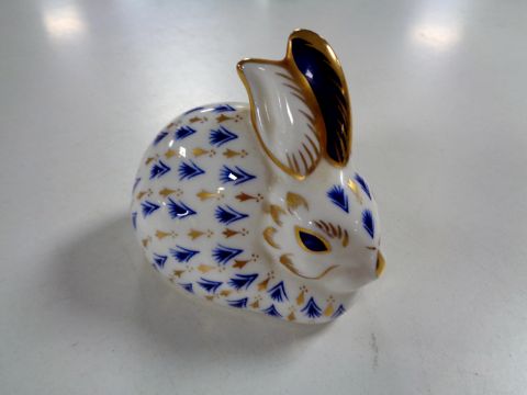 A Royal Crown Derby rabbit paperweight with gold stopper.