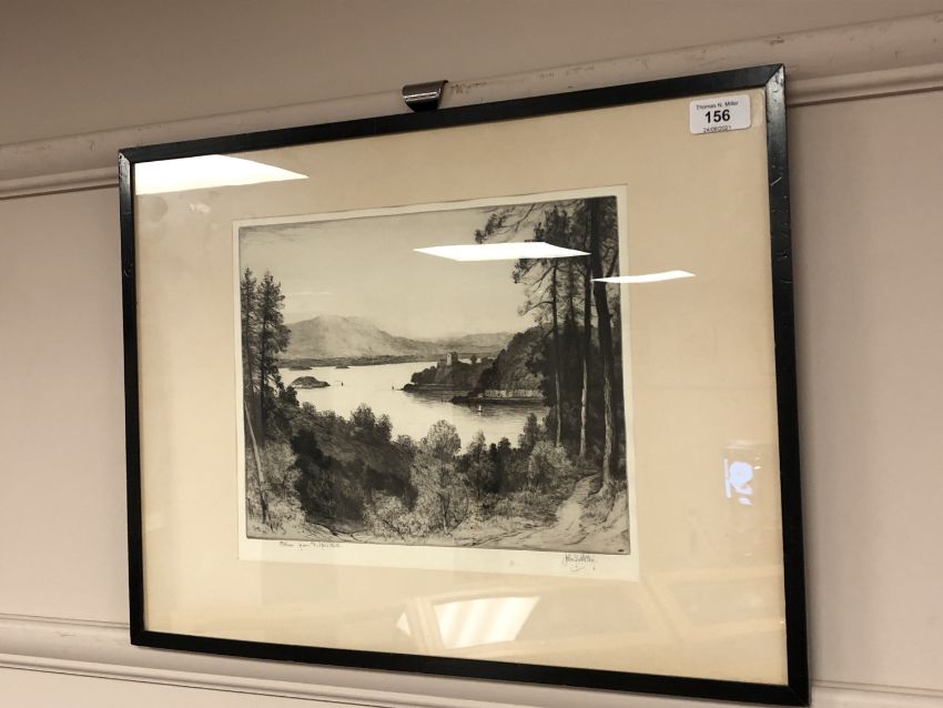 John Fullwood : Oban (From Pulpit Hill), drypoint etching, signed and titled in pencil, 23 cm x 30 cm, framed.