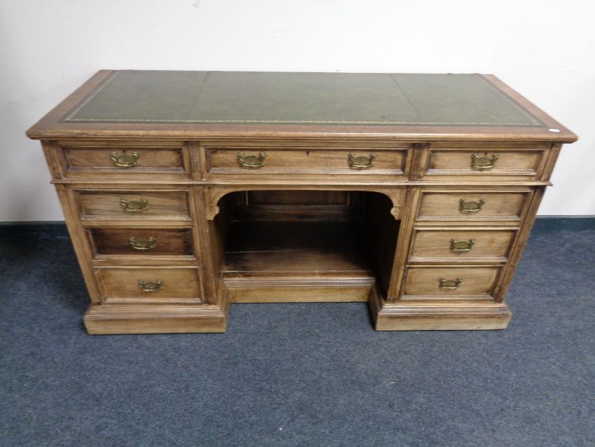 A 19th century oak twin pedestal desk fitted nine drawers with a green tooled leather inset panel
