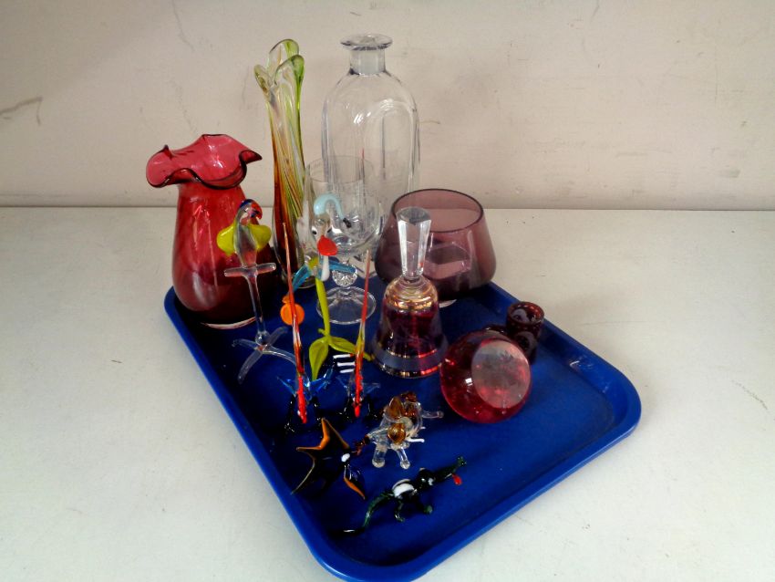 A tray containing murano glass ornaments, coloured glassware, Caithness paperweight, etched glass hand bell, an etched wine glass marked The Rt. Hon. The Lord Barnard Provincial Grand Lodge of Durham