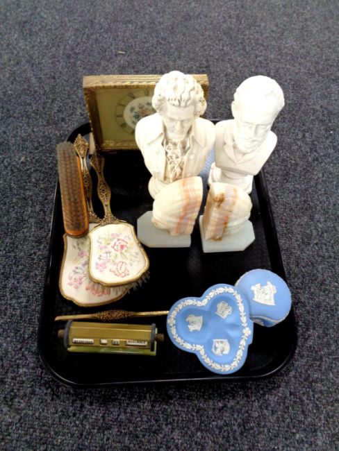 A tray containing blue and white Wedgwood jasperware, bust of Mozart, pair of onyx bookends, onyx and brass desk calendar, dressing table set