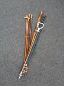 Two bundles of walking canes, umbrella with Scottie dog handle, shooting stick etc
