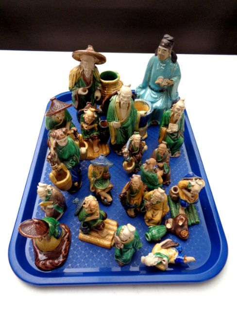A tray containing a large quantity of Chinese polychrome earthenware figures