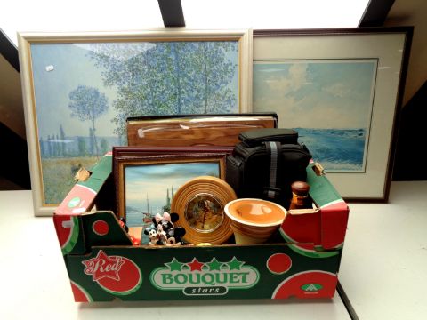 A box containing Trench Art dinner bell, contemporary mantel clock, cased manicure set, Disney figures, pictures and prints etc