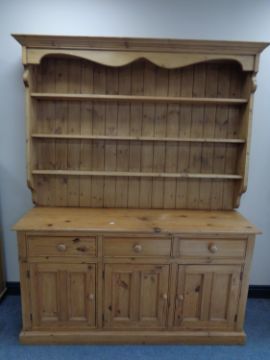 A pine kitchen dresser with plate rack above, fitted three drawers and doors beneath