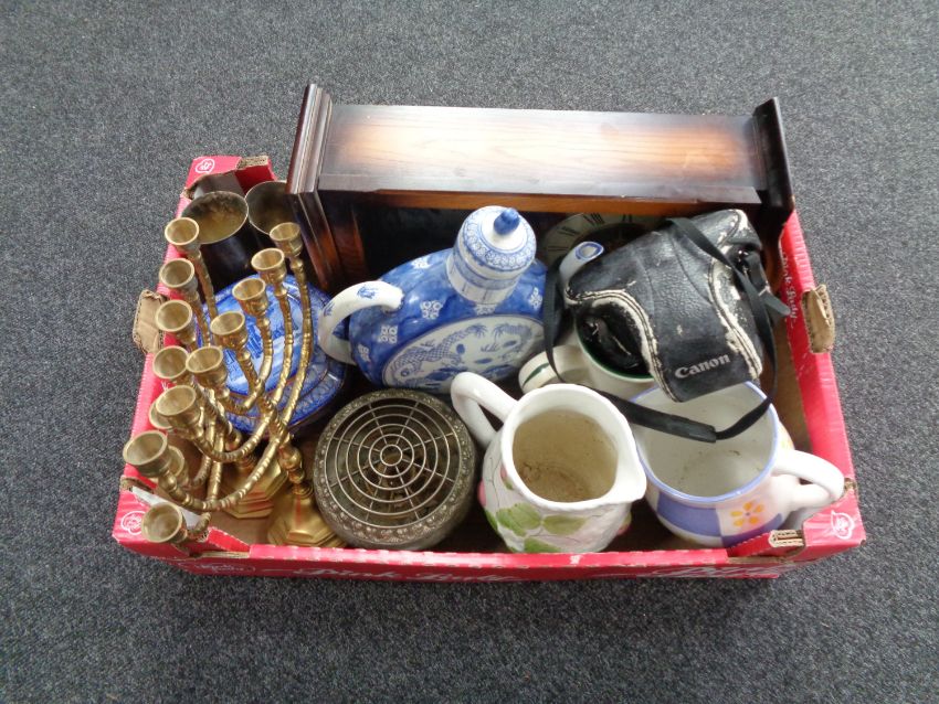 A box containing a contemporary wall clock, plated wares, Ringtons blue and white china, moonflask teapot, pair of brass seven branch menorah