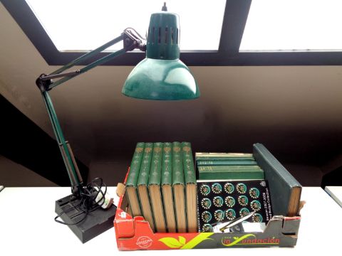 A green angle-poise lamp together with a box containing volumes including Thompson's Gardener's Assistant etc together with a quantity of Newcastle United football badges